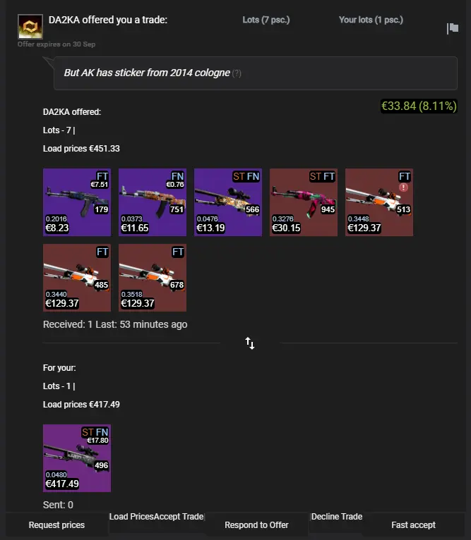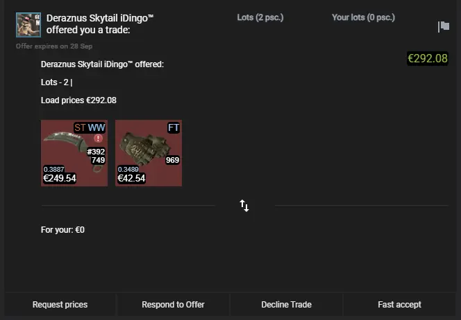 - Az nagyon fontos, hogy rendelkezned kell egy alap pénzügyi intelligenciával mivel a befektetés nem való mindenkinek. A minimum beszálló 300 euró értékű skin és amikor kiszállsz a profitnak a felét leveszem. Amennyiben érdekel ez a lehetőség irj a kapcsolatfelvételnél vagy keress meg steamen esetleg discordon.