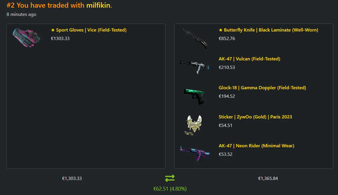 - A trade up lényege, hogy egy adott skinből egy értékesebbet csinálok folyamatos kereskedéssel. A kereskedést 2022-ben kezdtem el 2.000 dollárral és egy év alatt 8.000-10.000 dollárt értem el. Jelenleg lehetőséget biztosítok arra, hogy mások skinjeivel kereskedem és ezáltal jelentős hasznot realizálok neki.